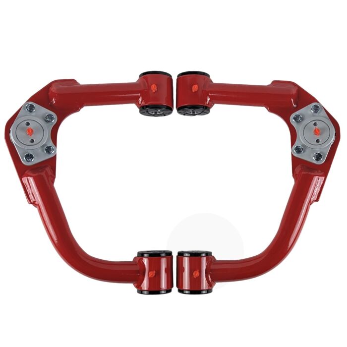 JBA Upper Control Arms are assembled and ready to bolt into your Ford! American-made steel tubing, red powder-coat finish, replaceable ball joints, 2 grease ports for the JBA EZ lube bushings, and 1 grease port for the ball joint.