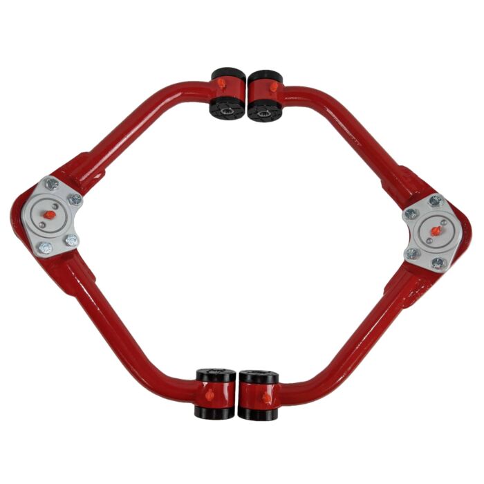 American-made steel tubing, red powder-coat finish, replaceable ball joints, 2 grease ports for the JBA EZ lube bushings, and 1 grease port for the ball joint. Ball joints are mounted on an angle to line up with the steering knuckle.